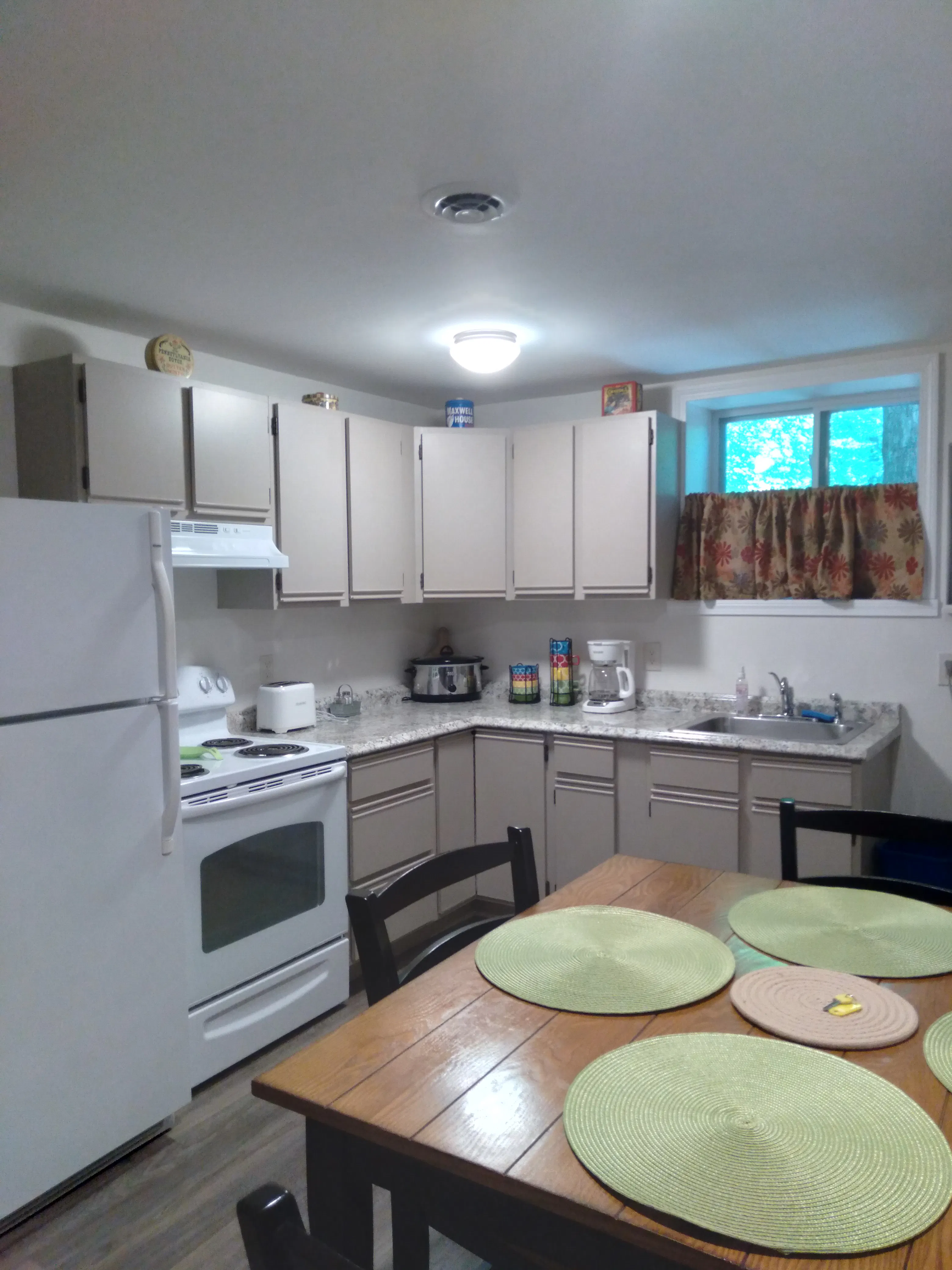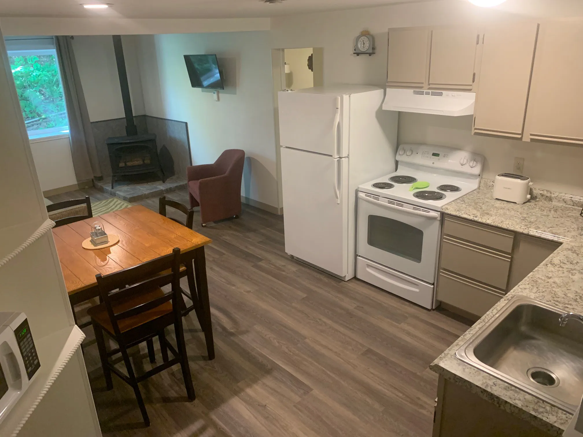 Fully Furnished Open concept Living, Kitchen, & Dining with 2 separate Bedrooms each with Memory foam Queen Mattress. Propane Decorative stove, 50" Flat screen TV with Roku. All necessary cooking, dinnerware, utensils provided. All Linens and towels provided. Microwave, slow cooker, toaster, coffee maker all provided.